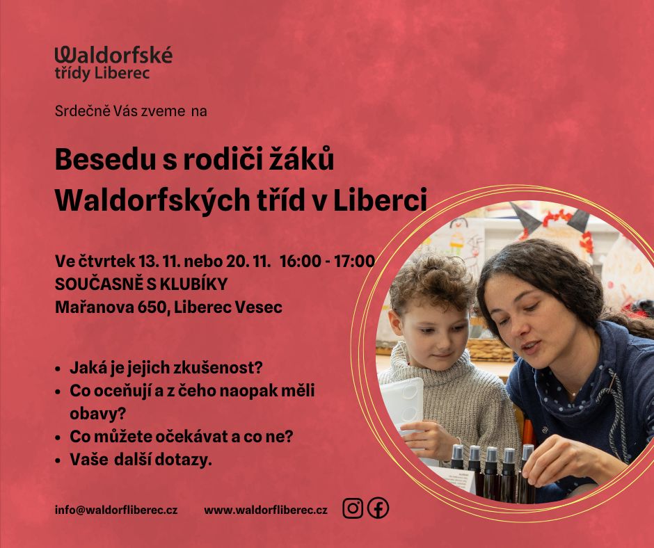 Srdečně Vás zveme na besedu s rodiči žáků Waldorfských tříd v Liberci, která se uskuteční ve čtvrtek 13. 11. a 20. 11. od 16:00 do 17:00.